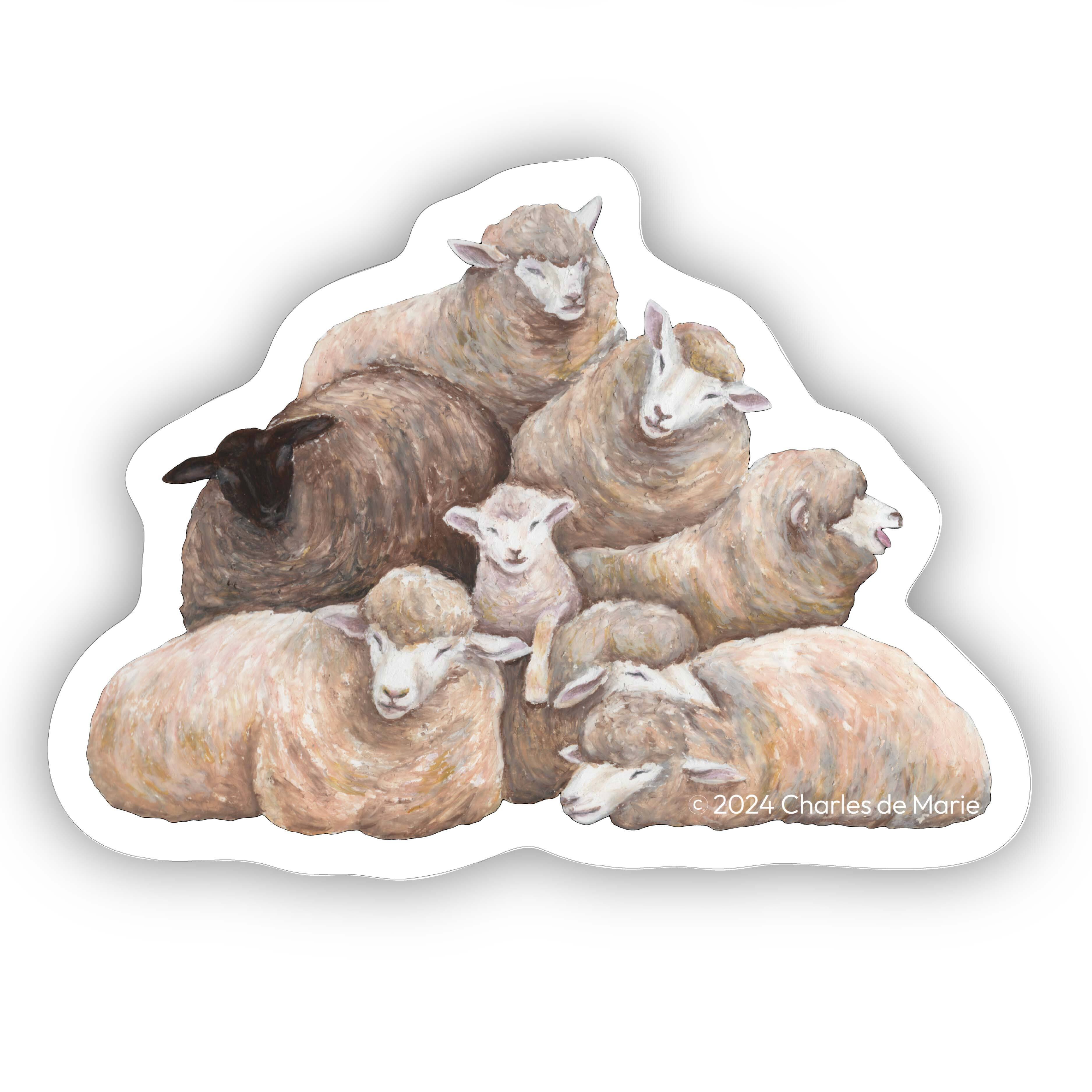 オイルパステルで描かれた羊たちが、ステッカーに登場。